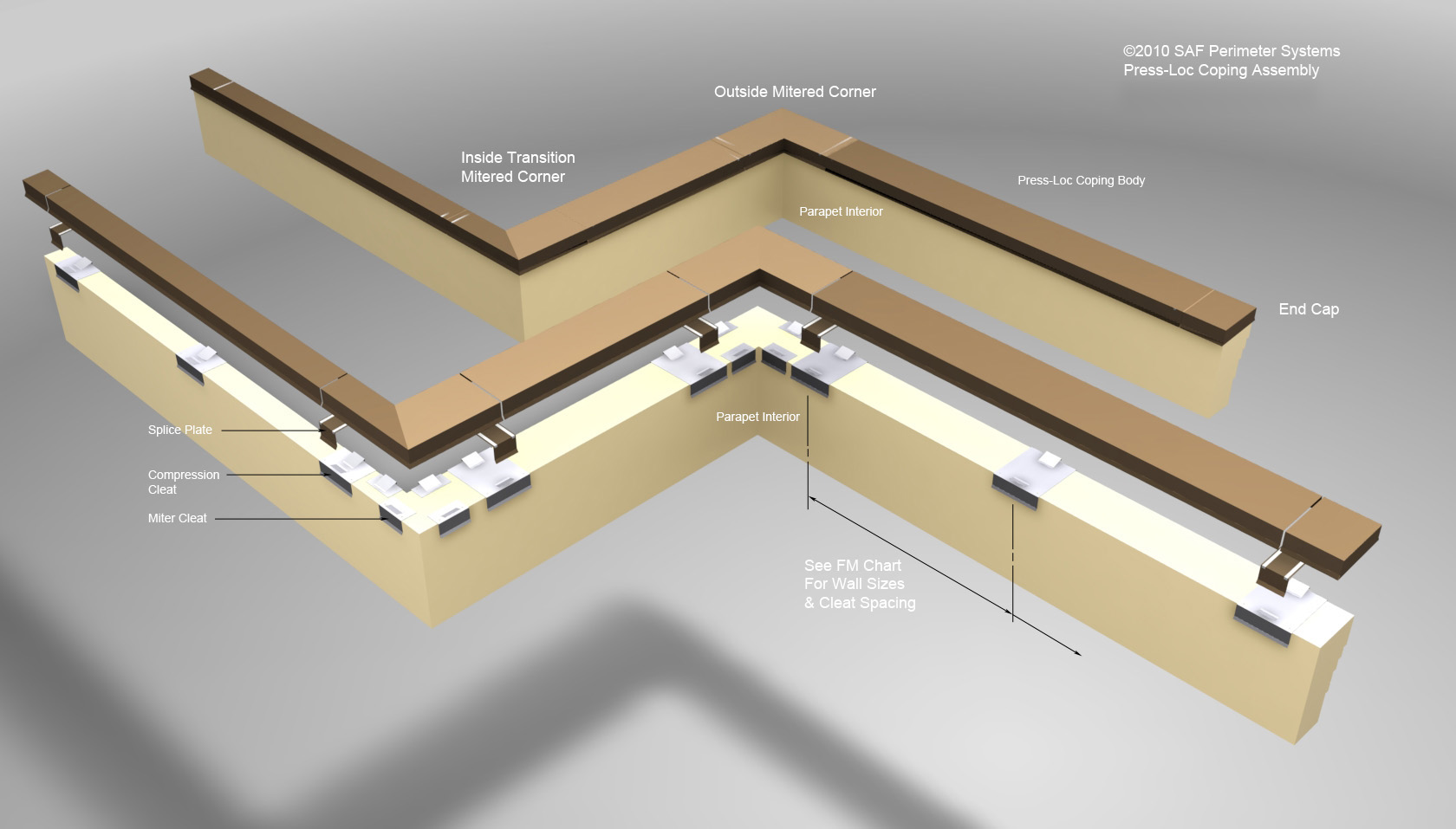 Custom fabricated Coping Systems from SAF Perimeter Systems offer customers two proven design choices. Both Press-LOC or CP Systems provide superior, maintenance-free protection for a variety of parapet wall types. For finishes, choose from 56 EZ Mix Kynar 500 standard colors, or a custom match. Standard 10’ lengths are typically pitched for positive drainage to a roof deck, but pitched, flat or peaked top profiles are no problem. Each style can be fabricated in a variety of metal types & thicknesses. Additionally, 6” concealed splice plate joints allow coping to expand and contract to weather climate variations.